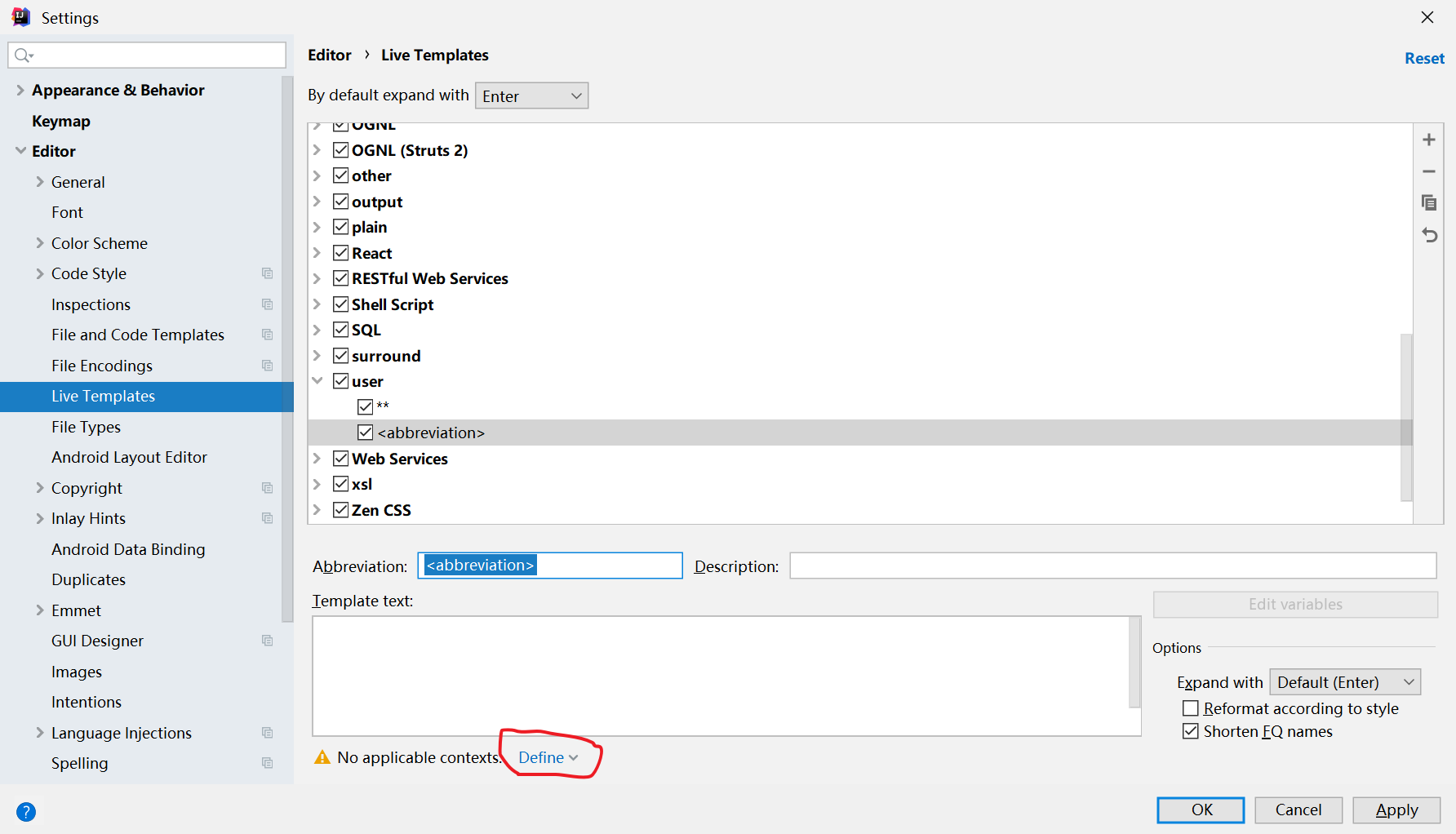 点下面的define设置模板生成的地方,选择java下面的所有,或者选everywhere也行
